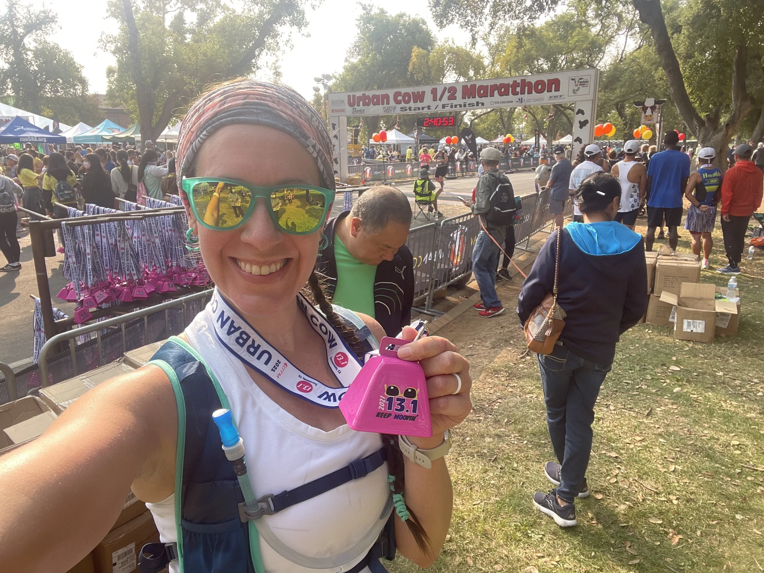 I stuck with these short 2-3 mile runs for about a year when my local run club started hosting in-person training groups again in 2021. My therapist had encouraged me to find some kind of community activity to re-join the living and I signed up for a trail running group without knowing what I was getting into. I started with a 5k trail run goal and absolutely fell in love. I learned about proper running form (still a work in progress), hydration, nutrition, appropriate gear. We ran up and down the hills of Vacaville in the hot hot heat of summer and I loved it. I started forming a new group of friends and challenged myself to do something out of my comfort zone. By the end of the training, folks started talking about the half and full marathon training group starting up for the fall. I didn’t think there was any way I could run a half marathon; at that point, I think my longest run was about 4 miles. But I was loving it so much, I took a chance and joined.